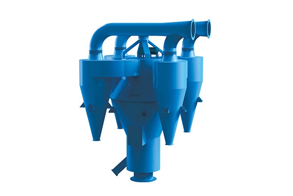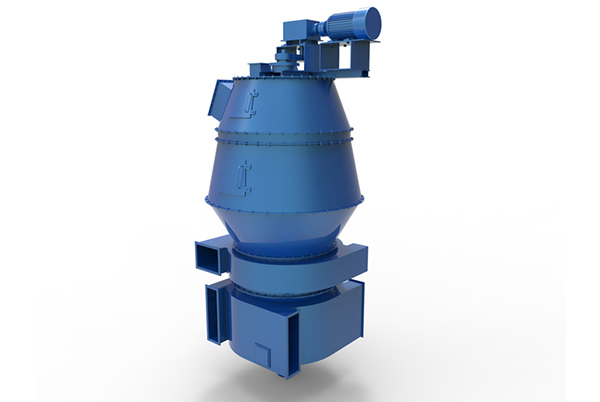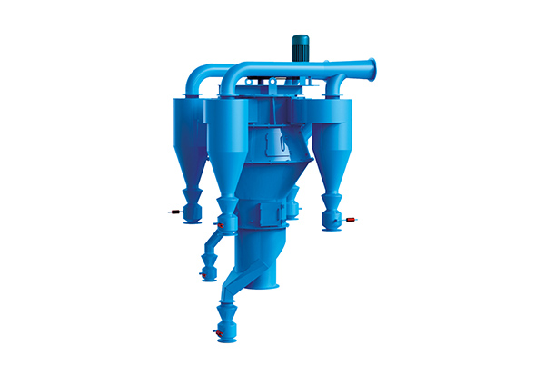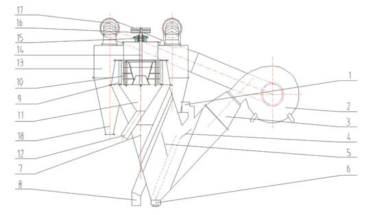 通過破碎機、制砂機、振動篩后制成0~4.75mm的人工砂,使用輸送設備從本機喂料口喂入,進入打散區,在若干組導流板與若干組反擊板的作用下,不同粒徑的砂在下落過程中,砂粒產生不同的下落速度,使砂粒與砂粒之間產生數次相對磨擦,這樣砂粒表面的泥粉和石粉被剝離開來,在風力作用下迅速離開砂的表面,這樣就能將砂充分地清洗干凈。 入口1進來的物料經多級打散板4打散、剝離,各打散板之間從左側吹來的風將料流中的中粗料及細料吹離,粗砂從底部粗砂出料口6排出。懸浮于氣流中的物料隨風進入分級區的多層分級板5之間,分級板將懸浮于氣流中的物料進一步去除相對較粗的物料,粗料沿分級板下滑,被風再次吹起,反復分選,后粗粉并入粗砂。出分級板的風帶料進入中料分級區,在中料分級區由于氣流減速,方向偏轉,產生中砂的重力沉降和撞擊器壁而沉降,中砂從中砂出口8排出。氣流帶料進入細料分級區,在細料分級區,在弧形導流板9作用下產生旋轉,形成離心沉降和重力沉降雙重作用,細砂落入下方細砂集料錐11,由細砂出口12排出。粉料隨氣流進入脫粉區,在籠形轉子10的作用下甩出稍粗料(細砂),細砂撞擊弧形導流板落入細砂收集錐,含粉氣流進入旋風筒進行氣固分離,分離出的細粉由粉料口18排出,較為干凈的空氣經出風管17進入風機循環使用。