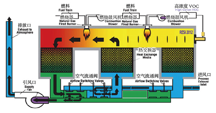 ![]() 工作原理 PDR-RTO是將傳統RTO結合高溫脈沖波反應器的焚化爐,PDR處理難處理及高濃度VOCs氣體;燃燒室內置水管式鍋爐,有效回收過剩能源;蓄熱床能源效率和破壞效率高。PDR-RTO產品組合能夠很好的處理高濃度以及低濃度VOCs,以及濃度變化跨度比較大的VOCs氣體。能夠達到VOCs處理99%,熱回收效率達到95%以上。